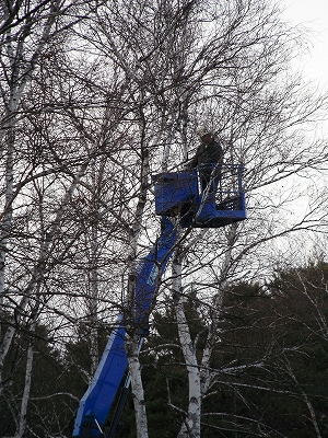 造園業者さんが、高所作業車でシラカバの枝打ちをしていました。
