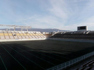 冬の寒さから芝生を守るため寒冷紗を敷き、この状態で春が来るのを待ちます。