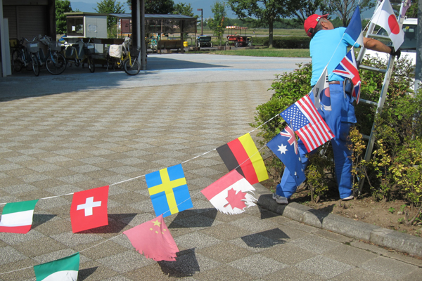 南管理棟にて青空の下、万国旗の交換作業を行いました。