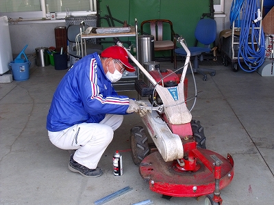 さて、スカイパークのスタッフは、ピロティーで芝刈り機の修理を行っております。