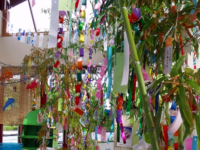 ロビーは青々した竹に色とりどりの短冊やお飾りが、 吹き抜ける風にサヤサヤとそよいでいます。 バザーに出品されるものも盛りだくさん、 思いっきりお買い得♡♡♡で、皆様をお待ちしています!! 例年、人気の射的(1回百円)は、当てた景品の中には、 ソラヤさんのソフトクリーム券なども♡♡♡ スーパーボールすくいは(百円)、 あの懐かしい『金魚すくい』の要領でね♡♡♡ お菓子釣り(一回百円)は、お子様の好きなお菓子から、 一緒に見えるお父さん・お母さん用に、 缶ビールも釣っていただけます。 10日は、自転車教室があります。 自転車に乗れるようになるトレーニング、 『ウォーキングバイク』の教室です。 午前・午後、1回づつ開催。参加費1,500円です。 建物の入口には、鮮やかなマリーゴールドのプランターと、 マジェンダー色(赤紫)のセンニチコウがお迎えします。 幸い9日・10日はお天気も上々そうです!! どうぞ、南管理棟『七夕祭り』にお出掛け下さいませ!! ところで、今年は織姫と彦星は無事にデートができたのでしょうか? たまには星空を見上げ、お月見をして見ましょう♡♡♡