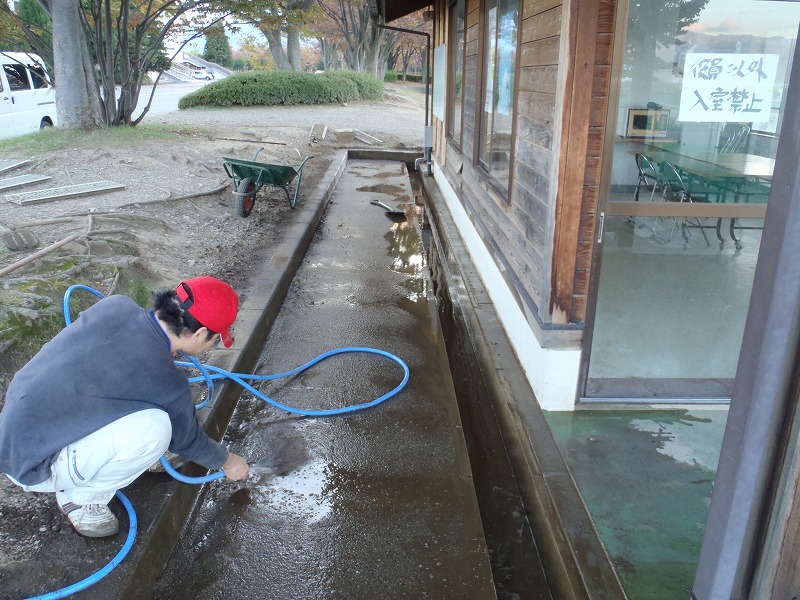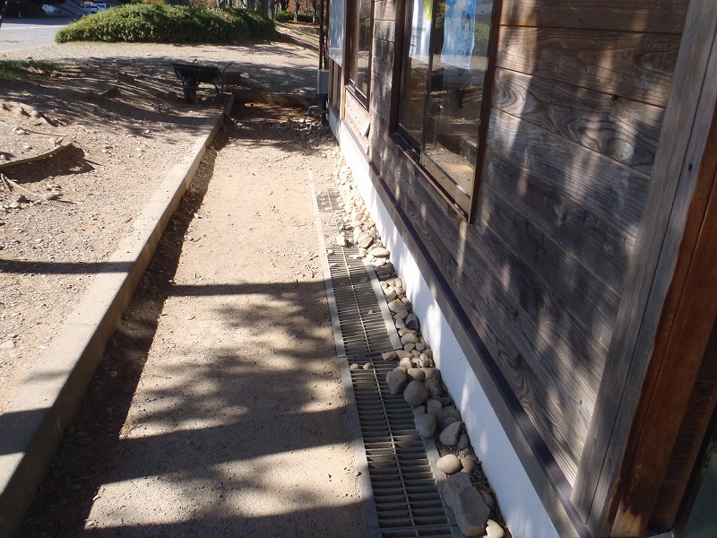 テニスコート管理棟の周りの石 土砂そして U字溝の中に溜まった土をとりのぞいてしまいました。