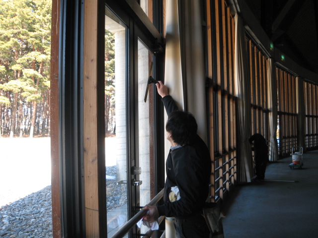 やまびこドームのガラス清掃の様子です