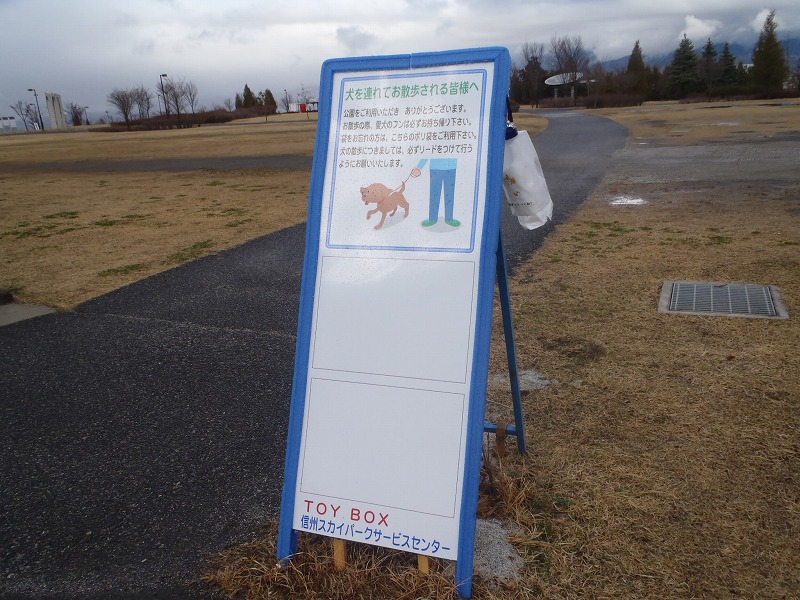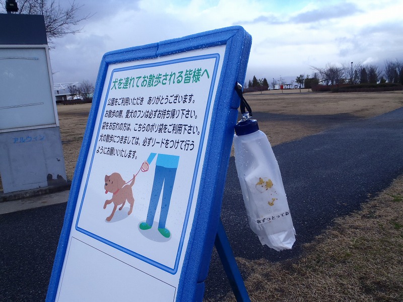 看板の横に、ビニール袋をぶらさげましたので、糞のお持ち帰りにご協力ください。