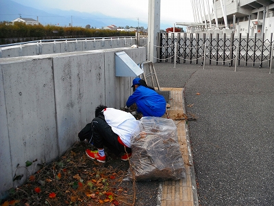 陸上競技場の排水溝に溜まった砂も掻き出して清掃しました。