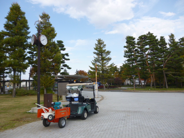 左は、発電風車付の時計塔、右奥にソーラー外灯が見えます。