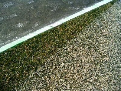 そこで、冬に入る間際に保護シートを敷設します。保護シート敷くことにより春先になって、芝生の生長の立ち上がりが大きく変わってきます。