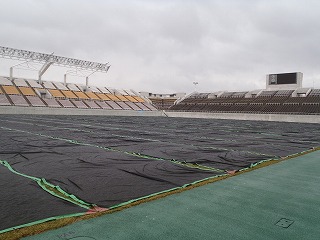アルウィンピッチに残っていた雪もすべて融け、黒い養生シート(寒冷紗といいます)が