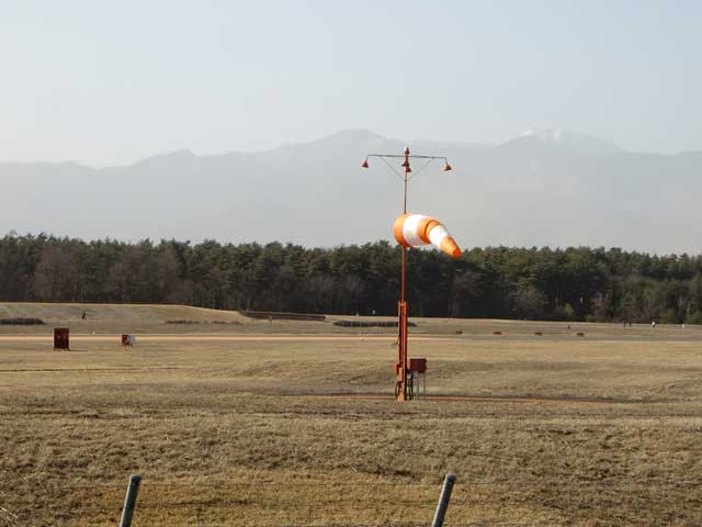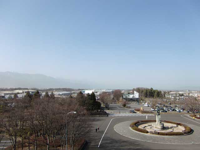 午後、園内へ出かけると相変わらず強い西風が吹いており、周囲の山々がかすんで見えました。
