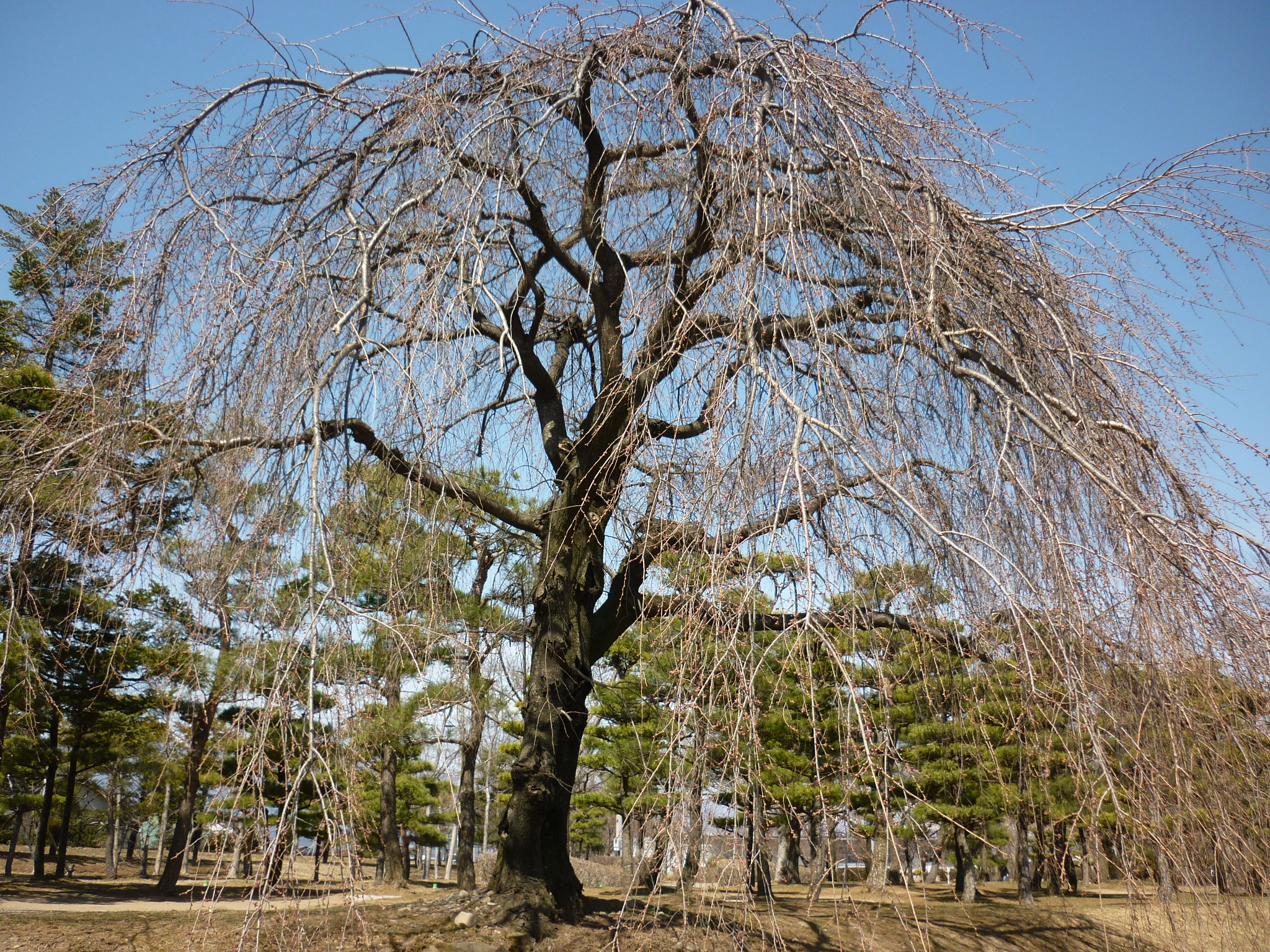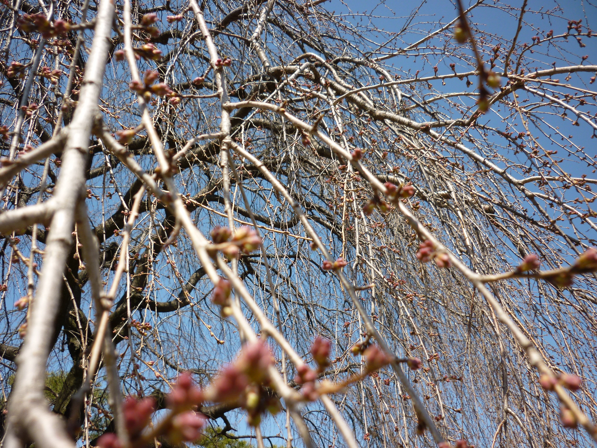 陸上競技場園内にあるしだれ桜のつぼみもほんのりと色がつきはじめました。