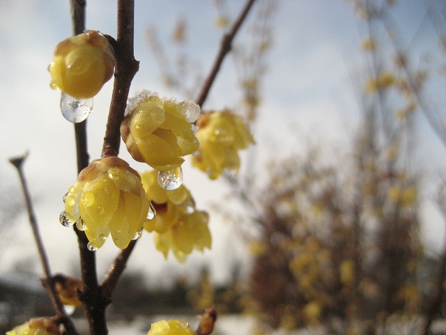 ろうばいにも、氷のしずくがついていました。でも、ろうのような花びらは、寒さに強いようです。