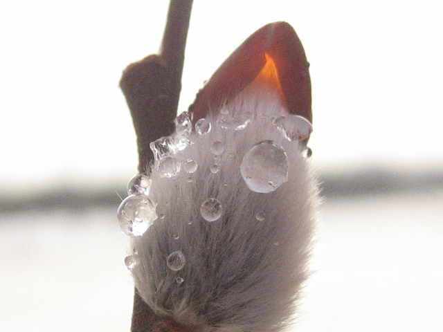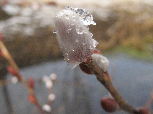 顔を出し始めたねこやなぎも、毛皮に氷がついて寒そうでした。
