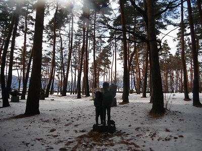 『触れる芸術』 肩を抱いて寒さに耐える兄弟の姿