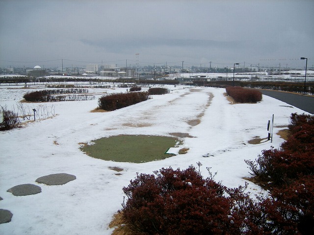 写真は午前中のみどりの交流ゾーンマレットゴルフコースです。雨によって雪も少しずつとけていました。雨のせいもあり、肌寒く感じました。