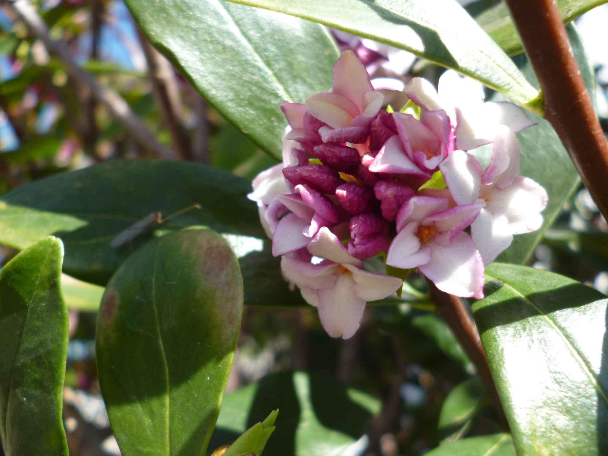 小さな花があつまって手毬状になる沈丁花、甘い香りがします。