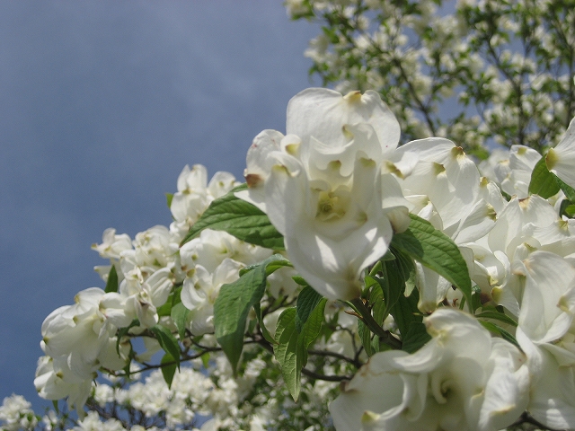 大きな木に、純白のひかえめなフリルと、若い葉の緑がきれいです。