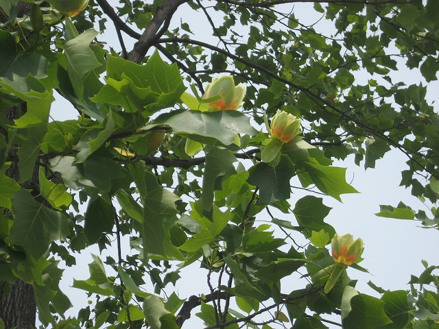 めずらしい木と聞いてハンカチノキを見にきたのに・・ という方には、花が終わってしまって、申し訳ありません。黄色いハンカチならずっと待ってますよね。 (若い方にはわからない話で失礼しました。) ちょっと気を取り直して、 せっかくですから「ユリノキ」はいかがですか? やまびこドーム東側の芝生広場のふち、他に木のないところに、 プラタナスに似た木が11本並んでいて、見つけやすいです。 今、こんな感じで、ユニークな花が咲いています。 別名チューリップの木、半纏木(はんてんぼく) みなさんには花がチューリップ、葉っぱがはんてんにみえるでしょうか? ナンジャモンジャノ木も、そろそろ終わりです。 これから楽しみなのはバラ。 スカイパーク6月号でも特集しています。 さくら