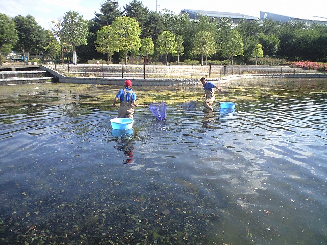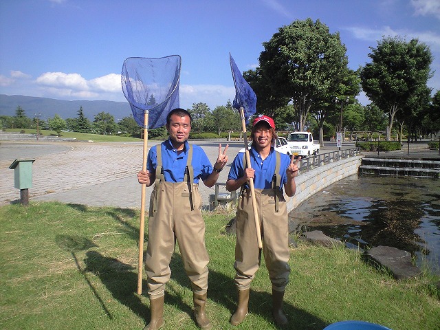 ターミナルゾーン 噴水池の藻とりをやっています。 毎年この時期、増えてくる藻。 これをとるのは結構重労働なのですが・・・ 今年は、この二人が大活躍!? 松本山雅FCでピッチを駆け回るこの二人! 山崎選手と今井選手です! 二人は主に、巡回作業担当なのですが、本日は気分新たに池の清掃作業です。 颯爽とゴム長を履き、網を手に池に入り、黙々と藻をとった二人・・・ 作業終了後、笑顔でしたが「・・・疲れました~」の一言。 やっぱり疲れるよね~、水の中歩くのは。 でも「いいトレーニングです!」と言いなおした二人はさすがアスリートです。 おつかれさまでした。おかげでキレイになりました。 しかし、山崎君・・・ゴム長似合うなぁ。 以上、ぱんだ副班長でした。