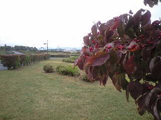 色づく実や葉が、周囲の緑に映えます。本日はあいにくの天気でしたが、天気の良い日はもっときれいに観えるでしょうね!