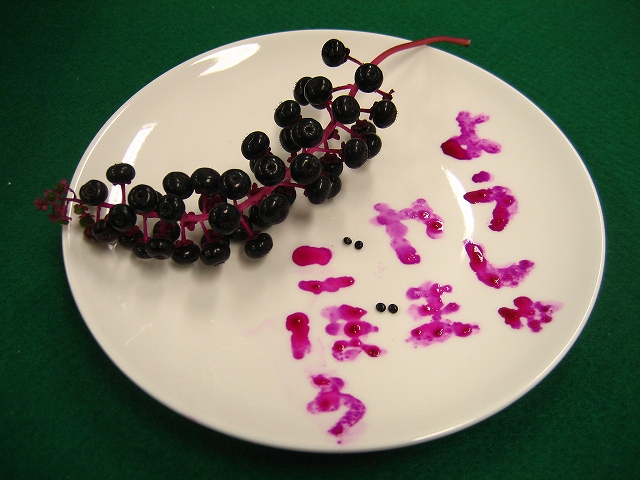 今日は、公園の巡回スタッフ提供の 木の実をご紹介します。 ブドウのような房状で、 粒を見るとブルーベリーのような形、 名前にはゴボウとありますが、 (洋種山牛蒡といいます) 食べてはいけません。 かたい種ばかりで、苦いです。 色あざやかな果汁で 絵を描いて遊ぶのが正解 さくら