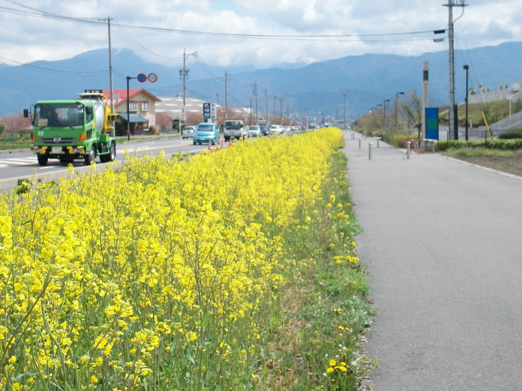 アルウィン方面おでかけの際は、アルウィン北側(高家線沿い)、で菜の花が満開。駐車場では、チューリップと芝サクラも咲いています。