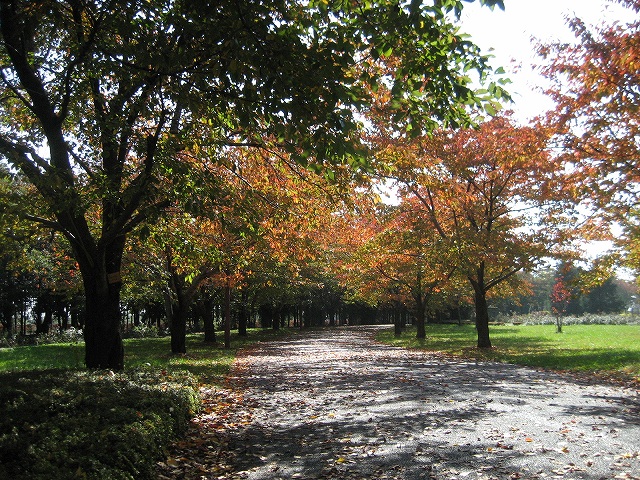 ↑こちら花のプロムナードゾーンの桜の並木道も、あざやかに色づいた葉が散り敷かれています。