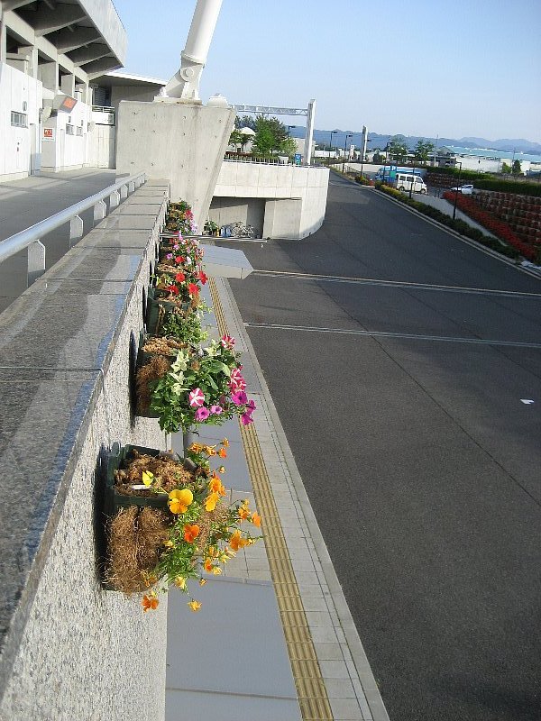 そして、アルウィン正面の壁面に、ペチュニア、ロベリア、インパチェンスなどを植えたハンギングバスケットを飾りました。あと、1ヶ月もするときれいに咲きそろい見ごろになりそうです。1ヶ月というと、5月31日ナビスコ杯予選が開催されます!みなさん、ぜひ見に来てくださいね。