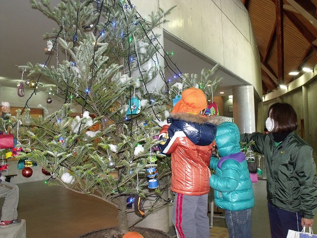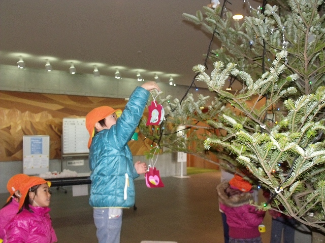 神林保育園の年長組さんが、やまびこドームに設置してあるモミの木に飾り付けをしてくれました。園児さんが手作りしてくれたベルや雪だるまなどを飾り付けました。モミの木がとてもにぎやかになり、クリスマスが来てもバッチリです。サンタさん、来てくれるかも知れません。(ドームには煙突ありませんが…)ちなみにモミの木には電飾も付けてあり、夜は21時30分まで光っています。とても綺麗です。