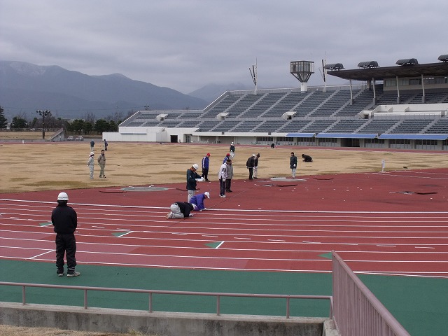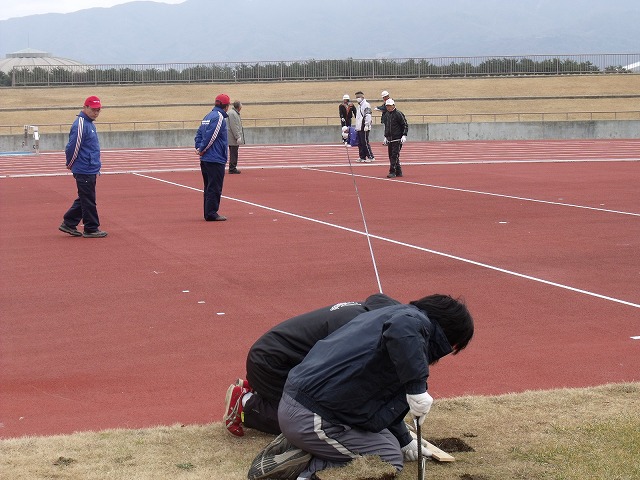 日本陸上競技連盟様をはじめ関係者のみなさんは、寒空の中、細かく距離や高さの測定を行っています。