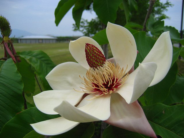 白い大きな花は「ホオノキ」。朴葉焼きで葉は知っていたものの、花は知りませんでした。