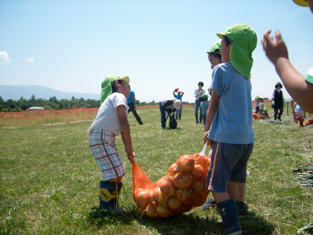 昨年、今井保育園のお友達と一緒に苗を植え、寒い冬を越え大きく育った玉ねぎを無事収穫することができました!! 今回の作業も今井保育園のお友達と一緒に行ったのですが、みんな一生懸命がんばりました! 収穫されたたまねぎは給食などに使われるとのこと。どんな献立になるのか楽しみですね。 袋にいっぱい入ったたまねぎ。 重いけど、がんばって運んでいます。 今年のたまねぎはとても大きく豊作でした。 また、秋には一緒に苗を植えましょうね。 この作業の様子を今井保育園のみんなが大きな絵にして南管理棟に飾ってくれました。ご来園の際は立ち寄っていただければと思います。 以上、ぱんだ副班長でした。