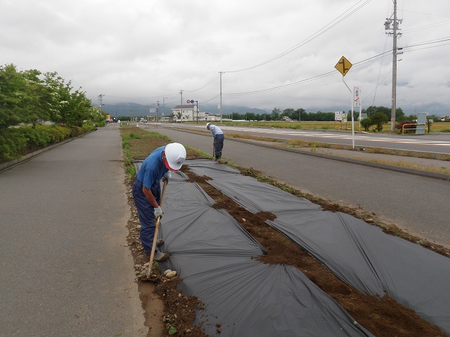 本日はアルウィン北側のアダプトにマルチを貼りました!そこにコスモスの種を播きます!
