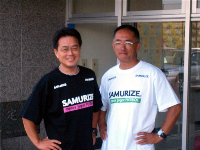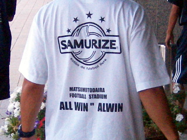 8月19日~24日に行われる全国中学校サッカー大会(全中)に合わせて アルウィングッズを制作しました。 「大会の記念になるようなアルウィングッズつくったらいいと思うよ~」 とアイデアを提供してくださったのが、下の写真左側のT先生です。 今週でき上がったばかりのTシャツを着て右の熱血N先生と一緒にはいポーズ! 背中には「ALLWIN ALWIN」と入っています。 芸能人御用達スポーツブランドSAMURIZEとのコラボ企画。 アルウィンとALL WIN(全勝!)をかけた縁起の良いTシャツです。 考案者はパンダ副班長。 他にもキーホルダーとお守り、うちわがあります。 窓口で販売していますので、皆さんお買い求めくださ~い。 by Pontarou