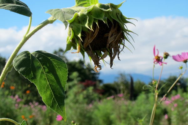 夏の花『ヒマワリ』の頭が垂れ