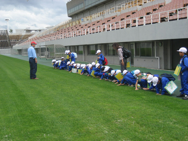 左の写真は源池小のみなさん。アルウィンピッチの感触をたしかめています。思ったよりも、やわらかいとみんな驚いていました。