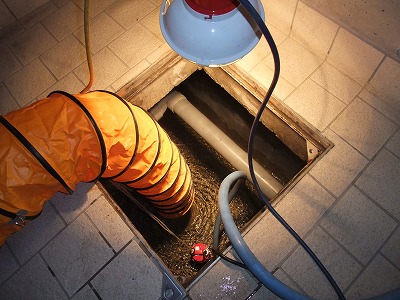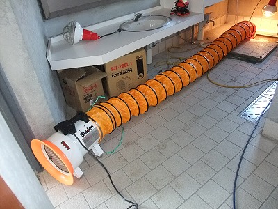 地下ピット内で作業を行う為、送風機で地下に空気を送り込みます。↓