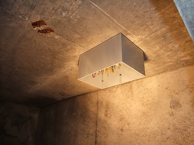 地下ピット天井に防水プルボックスを固定しケーブルを収め、後は蓋をし隙間をコーキングします。↓