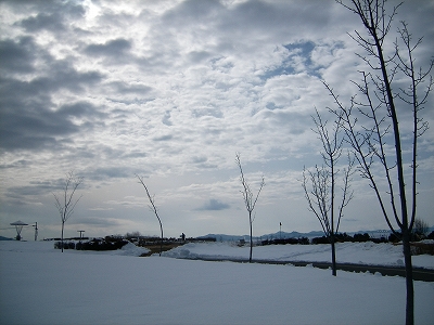 芝生地には先日の雪が残っていて、