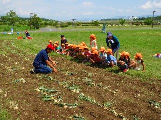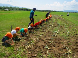(園児たちが収穫したタマネギをスタッフが回収し、